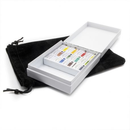 Contenuto: Giallo hansa, giallo indiano, arancio di cadmio, opera rose flamingo, perla di Murano, lacca di garanza, verde linfa, rosso di vite, blu cobalto, blu oltremare, viola orchidea, turchese di cobalto