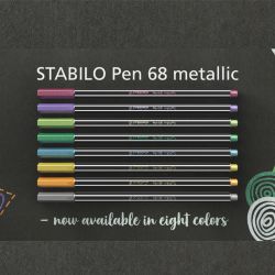 Brister con 8 pennarelli Stabilo Pen 68 metallizzati (oro, argento, rame, blu, rosa, lilla, verde e verde chiaro) ideali per un tocco di originalità alle tue creazioni. Grazie alla perfetta copertura su carta e cartoncini neri e alla robusta punta M ogni tratto risulterà luminoso e brillante.