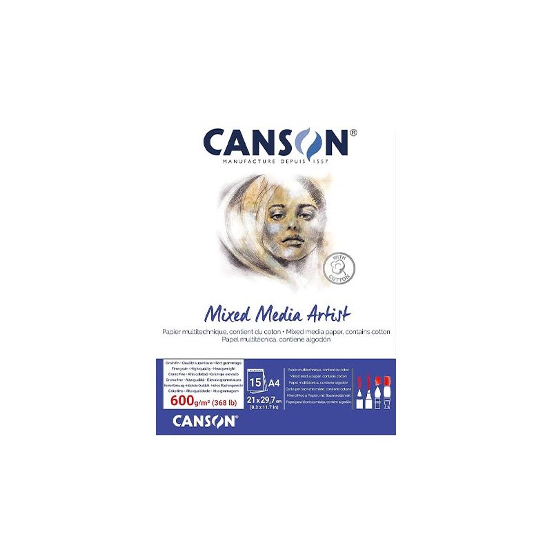 I blocchi di carta Mixed Media Artist di Canson possono essere utilizzati con tutte le tecniche di disegno e pittoriche, in particolar modo con acquerello e inchiostro. Questa carta è realizzata con una mescola di cellulosa e cotone, presenta una grana fine. Disponibile ultimo pezzo con grammatura 600gr. in formato A4 con 15 fg.
