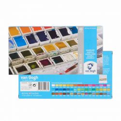 Questa pratica scatolina di metallo contiene 48 mezzi godet di acquerelli fini del marchio olandese Van Gogh + un pennellino sintetico tascabile per acquerello.