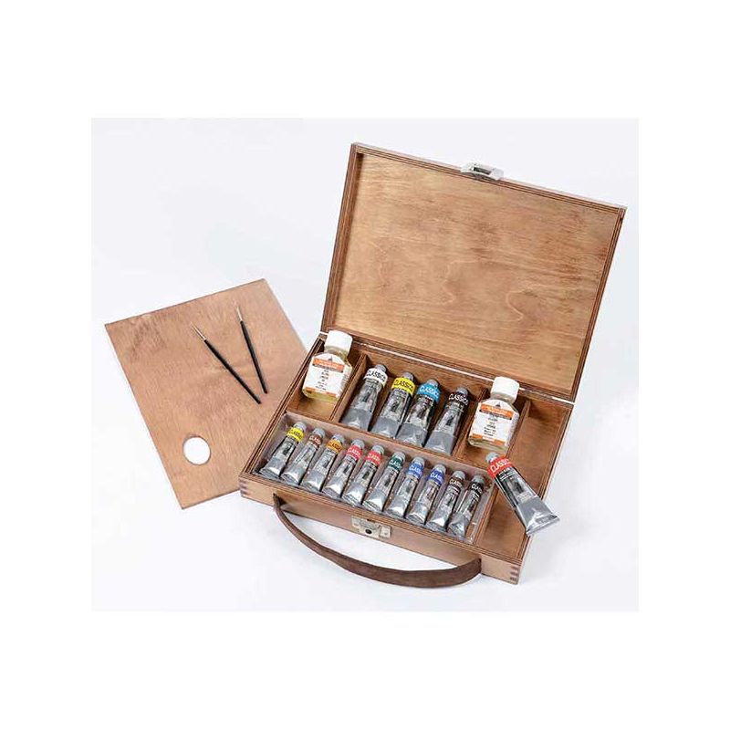 Cassetta completa di colori ad olio, ausiliari e strumenti per dipingere.